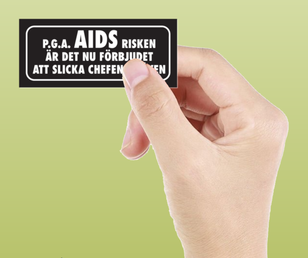 Skämtdekal P.G.A aids risken är det nu förbjudet att slicka chefen i röven